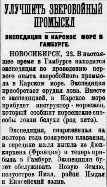 НОВОСИБИРСК, 23. В настоящее время в Гамбурге находится экспедиция по проведению первого опыта зверобойного промысла в Карском море. Экспедиция приобретает орудия лова. Вместе с экспедицией, в Карское море прибудет инструктор - норвежец, который сообщит норвежские способы ловли белухи (род кита).
