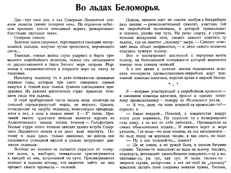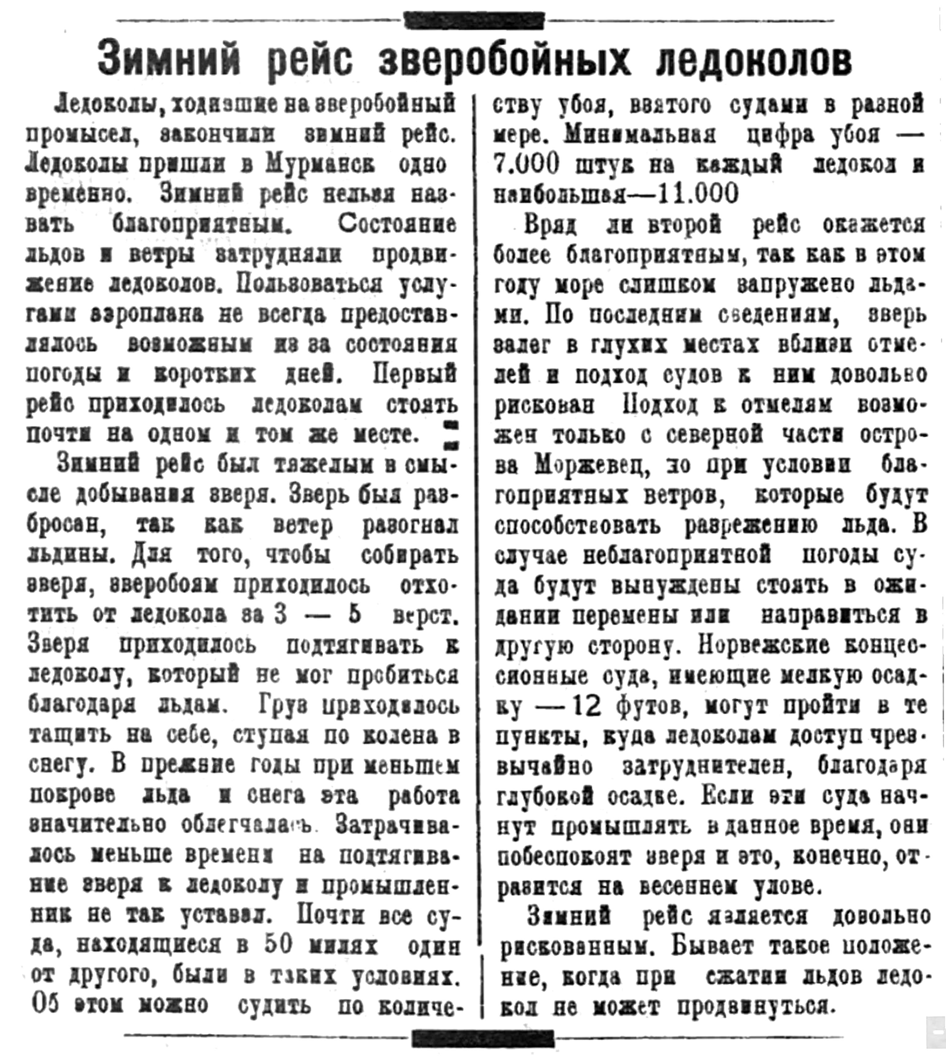 Ледоколы, ходившие на зверобойный промысел, закончили зимний рейс. Ледоколы пришли в Мурманск одновременно. Зимний рейс нельзя назвать благоприятным. Состояние льдов и ветры затрудняли продвижение ледоколов. Пользоваться услугами аэроплана не всегда предоставлялось возможным из за состояния погоды и коротких дней. Первый рейс приходилось ледоколам стоять почти на одном и том же месте. Зимний рейс был тяжелым в смысле добывания зверя. Зверь был разбросан, так как ветер разогнал льдины. Для того, чтобы собирать зверя, зверобоям приходилось отходить от ледокола ва 3-5 верст. Зверя приходилось подтягивать к ледоколу, который не мог пробиться благодаря льдам. Груз преходилось тащить на себе, ступая по колена в снегу. В прежние годы при меньшем покрове льда и снега эта работа значительно облегчалась. Затрачивалось меньше времени на подтягивание зверя к ледоколу и промышленник не так уставал. Почти все суда, находящиеся в 50 милях один от другого, были в таких условиях. Об этом можно судить по количеству убоя, взятого судами в разной мере. Минимальная цифра убоя — 7.000 штук на каждый ледокол и наибольшая—11.000.