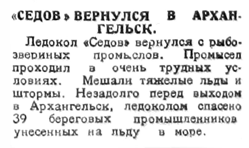 Ледокол «Седов» вернулся с рыбо-звериных промыслов. Промысел проходил в очень трудных условиях. Мешали тяжелые льды и штормы. Незадолго перед выходом в Архангельск, ледоколом спасено 39 береговых промышленников унесенных на льду в море.