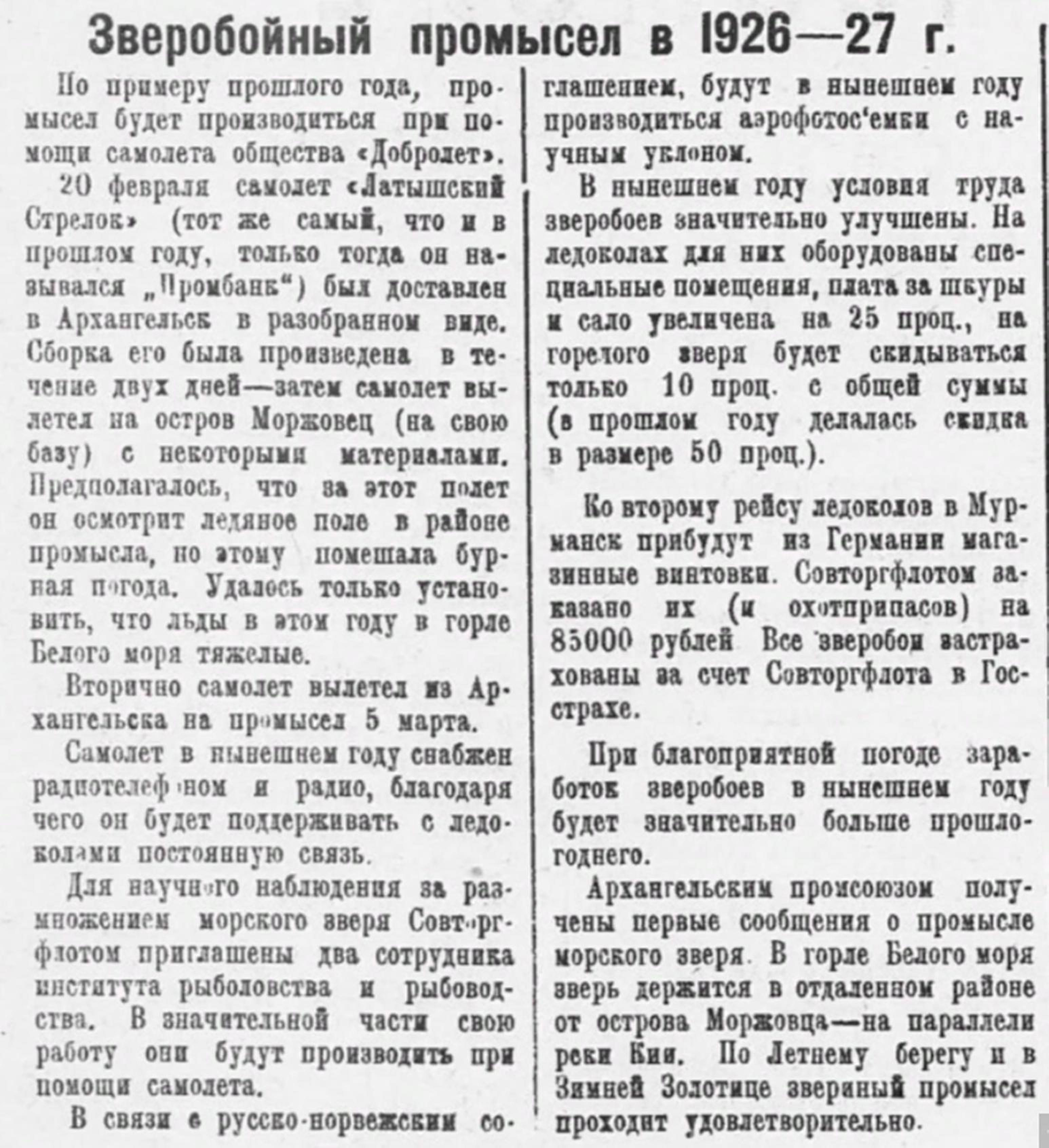 Ко второму рейсу ледоколов в Мурманск прибудут из Германии магазинные винтовки. Совторгфлотом заказано их (и охотприпасов) на 85000 рублей. Все зверобои застрахованы за счет Совторгфлота в Госстрахе.