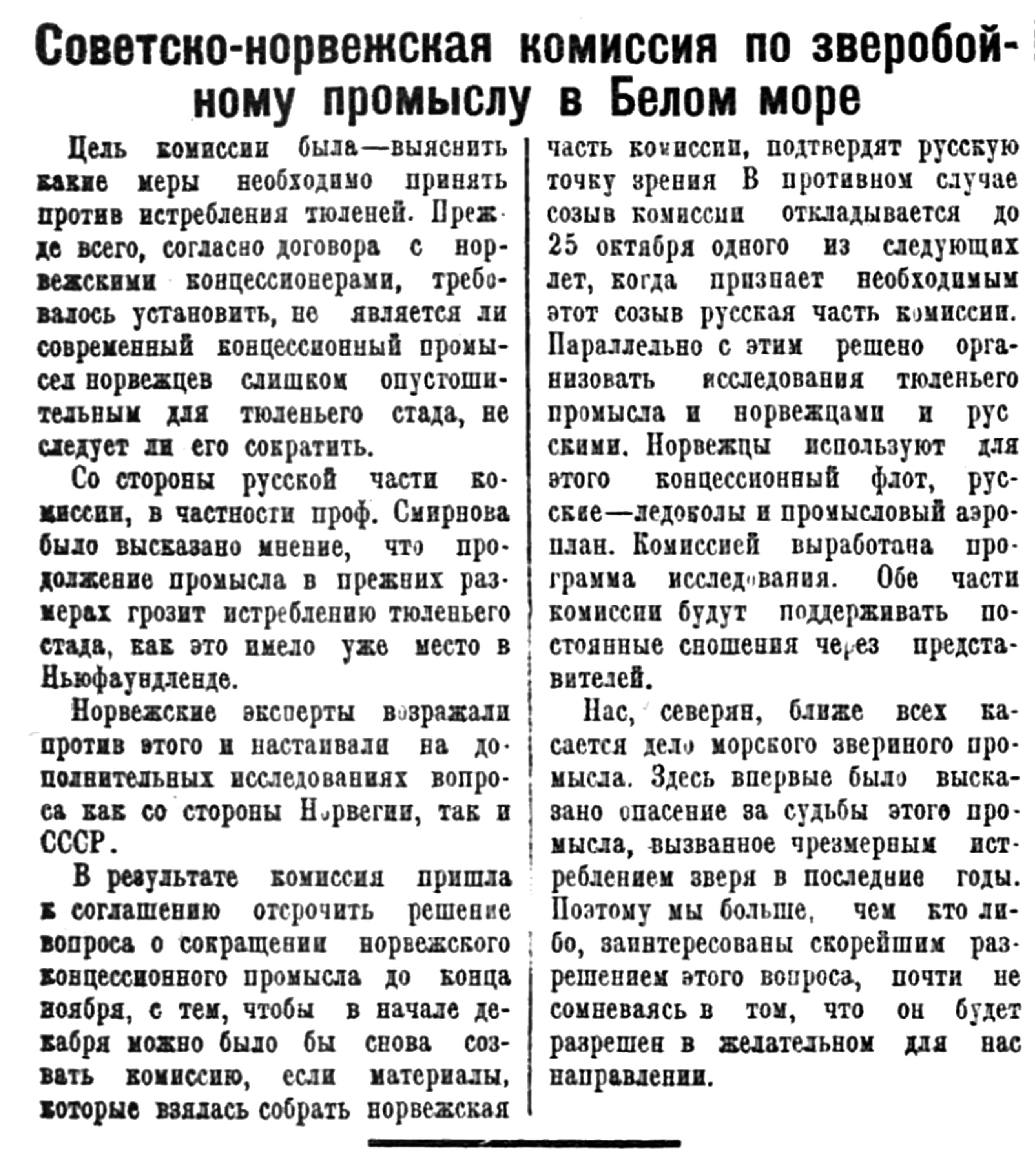 часть комиссии, подтвердят русскую точку зрения. В противном случае созыв комиссии откладывается до 25 октября одного из следующих лет, когда признает необходимым этот созыв русская часть комиссии. Параллельно с этим решено организовать исследования тюленьего промысла и норвежцами и русскими. Норвежцы используют для этого концессионный флот, русские — ледоколы и промысловый аэроплан. Комиссией выработана программа исследования. Обе части комиссии будут поддерживать постоянные сношения через представителей.