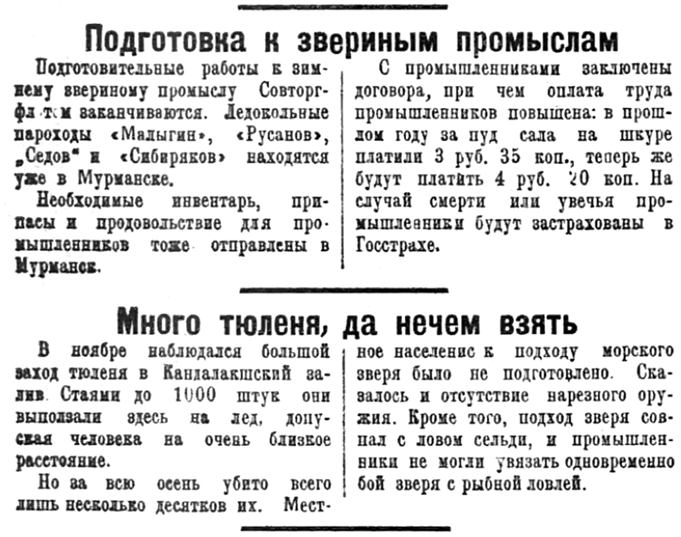 Архангельским промсоюзом получены первые сообщения о промысле морского зверя. В горле Белого моря зверь держится в отдаленном районе от острова Моржовца — на параллели реки Кии. По Летнему берегу и в Зимней Золотице звериный промысел проходит удовлетворительно.