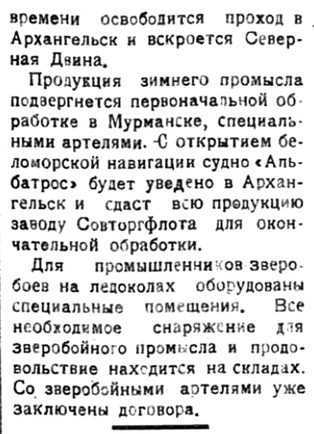 Продукция зимнего промысла подвергнется первоначальной обработке в Мурманске, специальными артелями. С открытием беломорской навигации судно "Апьбатрос" будет уведено в Архангельск и сдаст всю продукцию заводу Совторгфлота для окончательной обработки.