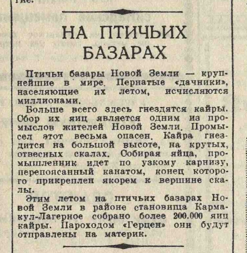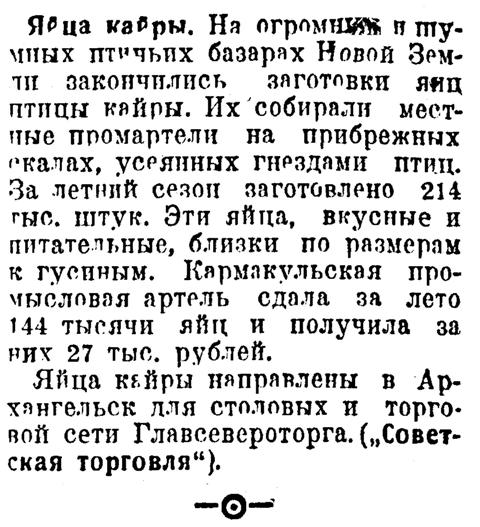 Яйца кайры. На огромных и шумных птичьих базарах Новой Земли закончились заготовки яиц птицы кайры. Их собирали местные промартели на прибрежных скалах, усеянных гнездами птиц. За летний сезон заготовлено 214 тыс. штук. Эти яйца, вкусные и питательные, близки по размерам к гусиным. Каракульская промысловая артель сдала за лето 144 тысячи яиц и получила за них 27 тыс. рублей.