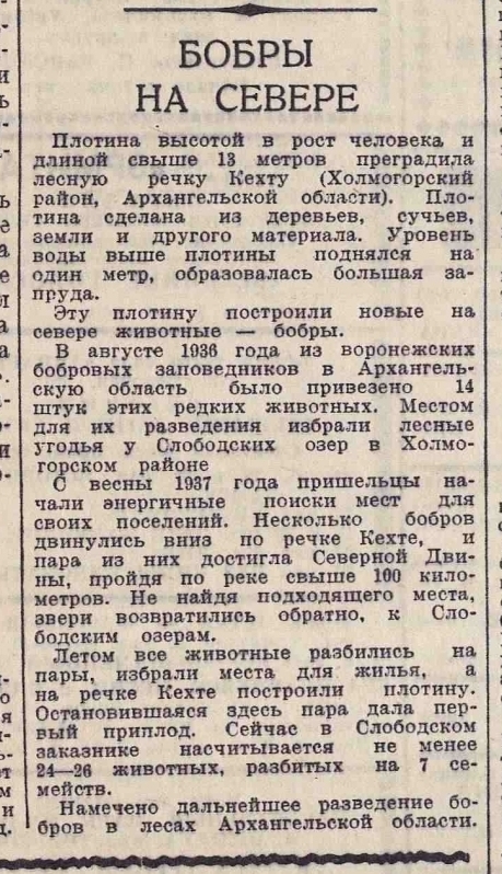 В июле 1934 г. в Лапландский заповедник прибывает партия бобров из Воронежского бобрового заповедника, которая и будет выпущена в один из водоемов в центральной части Лапландского заповедника для опыта реакклиматизации этого животного на Кольском п-ове.