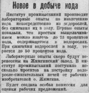 ВСНХ развертывает научно-исследовательскую работу по добыче иода, как из водорослей, так и из иодных источников. Кроме института промышленных изысканий к работе решено привлечь научные силы центра и других городов. На Летнем берегу Белого мори крайСНХ организуются курсы инструкторов по сбору и заготовке водорослей и золы.