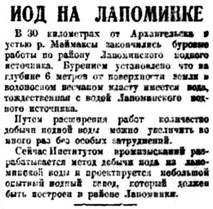 Госмедторгпром намерен с предстоящего 1930—31 хозяйственного года заняться добычей иода в заводском масштабе из подпочвенных вод Архангельского района. Сейчас в Лапоминке становится полузаводская установка, которая должна давать ежедневно около двух килограммов иода.