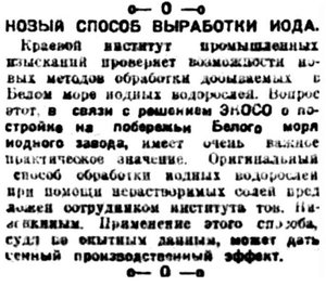 Организация на Севере иодной промышленности признана крайисполкомом делом первостепенной важности. Для руководства работой крайСНХ утверждено иодное бюро. Председателем бюро назначен тов. Шайкевич.