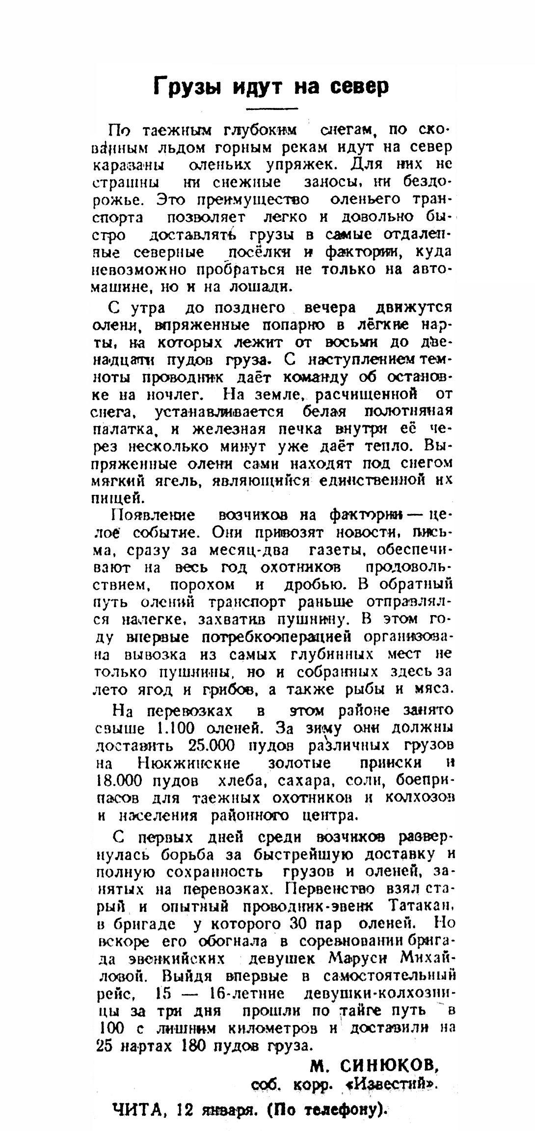 С первых дней среди возчиков развернулась борьба за быстрейшую доставку и полную сохранность грузов н оленей, занятых на перевозках. Первенство взял старый и опытный проводник-эвенк Татакан, в бригаде у которого 30 пар оленей. Но вскоре его обогнала в соревновании бригада эвенкийских девушек Маруси Михайловой. Выйдя впервые в самостоятельный рейс, 15 — 16-летние девушки-колхозницы за три дня прошли по тайге путь в 100 с лишним километров и доставили на 25 нартах 180 пудов груза.