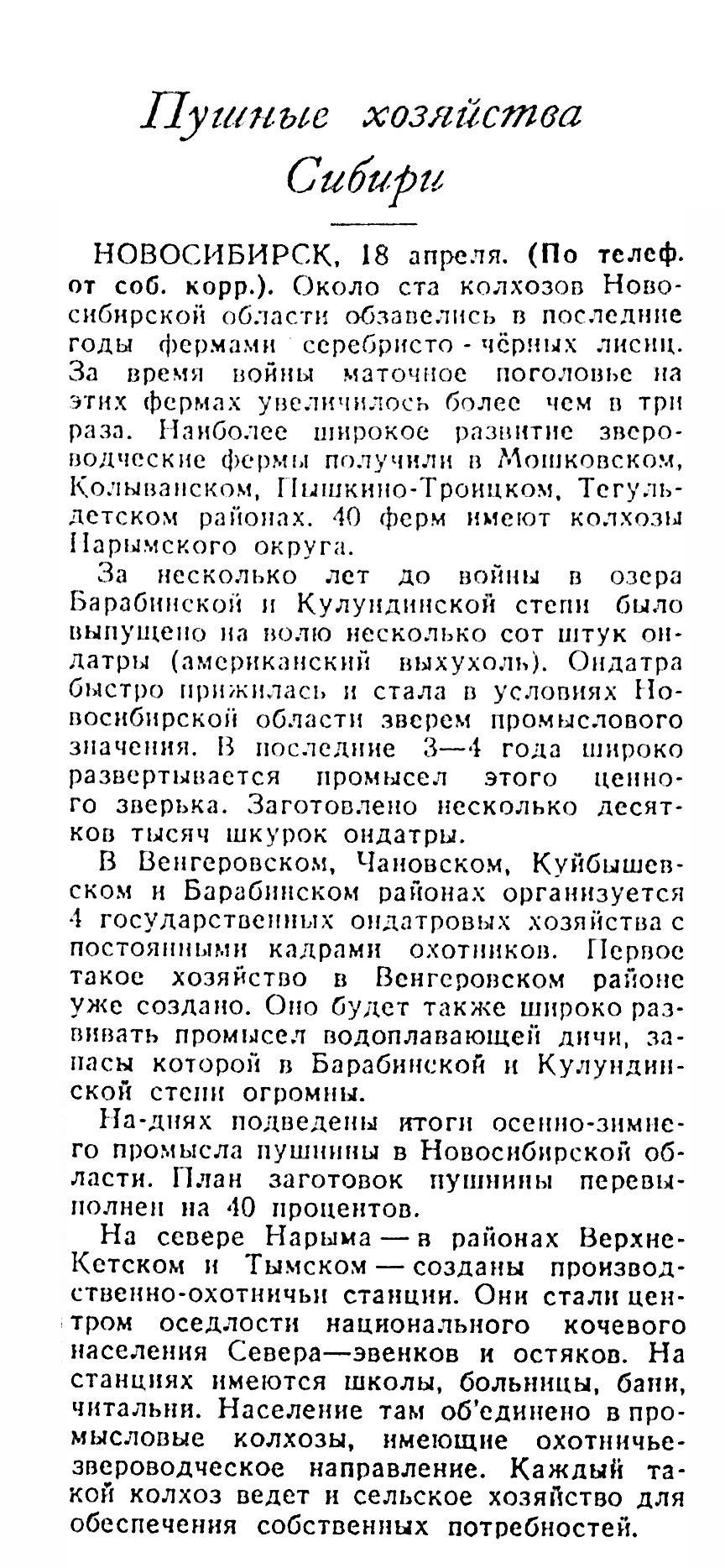 В Венгеровском, Чановском, Куйбышевском и Барабинском районах организуется 4 государственных ондатровых хозяйства с постоянными кадрами охотников. Первое такое хозяйство в Венгеровском районе уже создано. Оно будет также широко развивать промысел водоплавающей дичи, запасы которой в Барабинской и Кулундинской степи огромны.