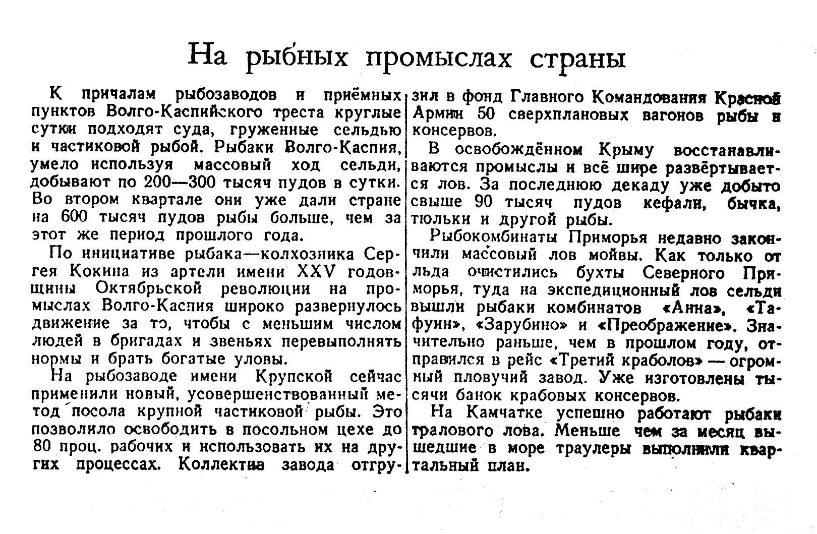 К причалам рыбозаводов и приёмных пунктов Волго-Каспийского треста круглые сутки подходят суда, груженные сельдью и частиковой рыбой. Рыбаки Волго-Каспия, умело используя массовый ход сельди, добывают по 200—300 тысяч пудов в сутки. Во втором квартале они уже дали стране на 600 тысяч пудов рыбы больше, чем за этот же период прошлого года.