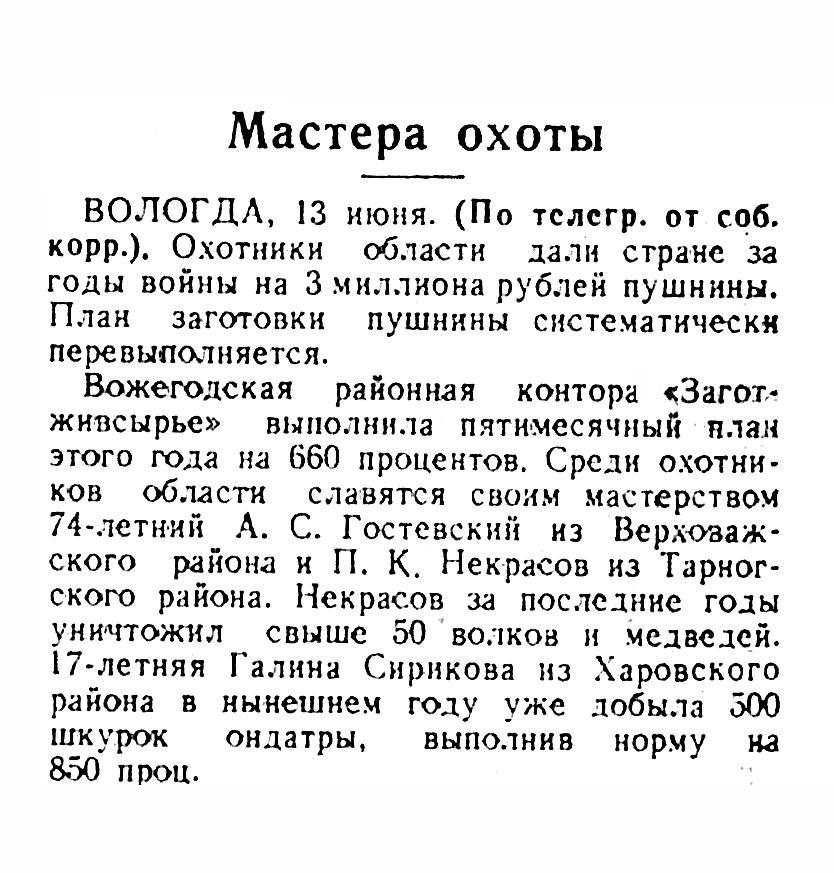 Вожегодская районная контора «Заготживсырье» выполнила пятимесячный план этого года на 660 процентов. Среди охотников области славятся своим мастерством 74-летний А. С. Гостевский из Верховажского района и П. К. Некрасов из Тарногского района. Некрасов за последние годы уничтожил свыше 50 волков и медведей. 17-летняя Галина Сирикова из Харовского района в нынешнем году уже добыла 500 шкурок ондатры, выполнив норму на 850 проц.