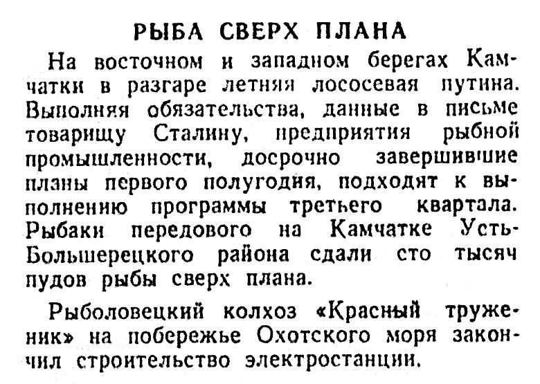 На восточном и западном берегах Камчатки в разгаре летняя лососевая путина. Выполняя обязательства, данные в письме товарищу Сталину, предприятия рыбной промышленности, досрочно завершившие планы первого полугодия, подходят к выполнению программы третьего квартала. Рыбаки передового на Камчатке Усть-Большерецкого района сдали сто тысяч пудов рыбы сверх плана.
