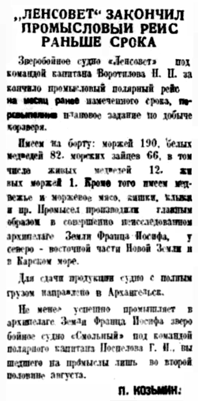 Правда Севера, 1932, №223, 26 сентября"ЛЕНСОВЕТ" ЗАКОНЧИЛ ПРОМЫСЛОВЫЙ РЕЙС