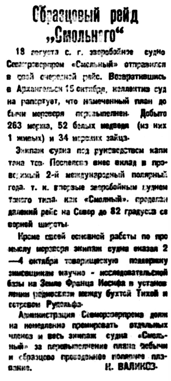 Не менее успешно промышляет в архипелаге Земля Франца Иосифа зверобойное судно "Смольный" под командой полярного капитана Поспелова Г. И., вышедшего на промыслы лишь во второй половине августа.