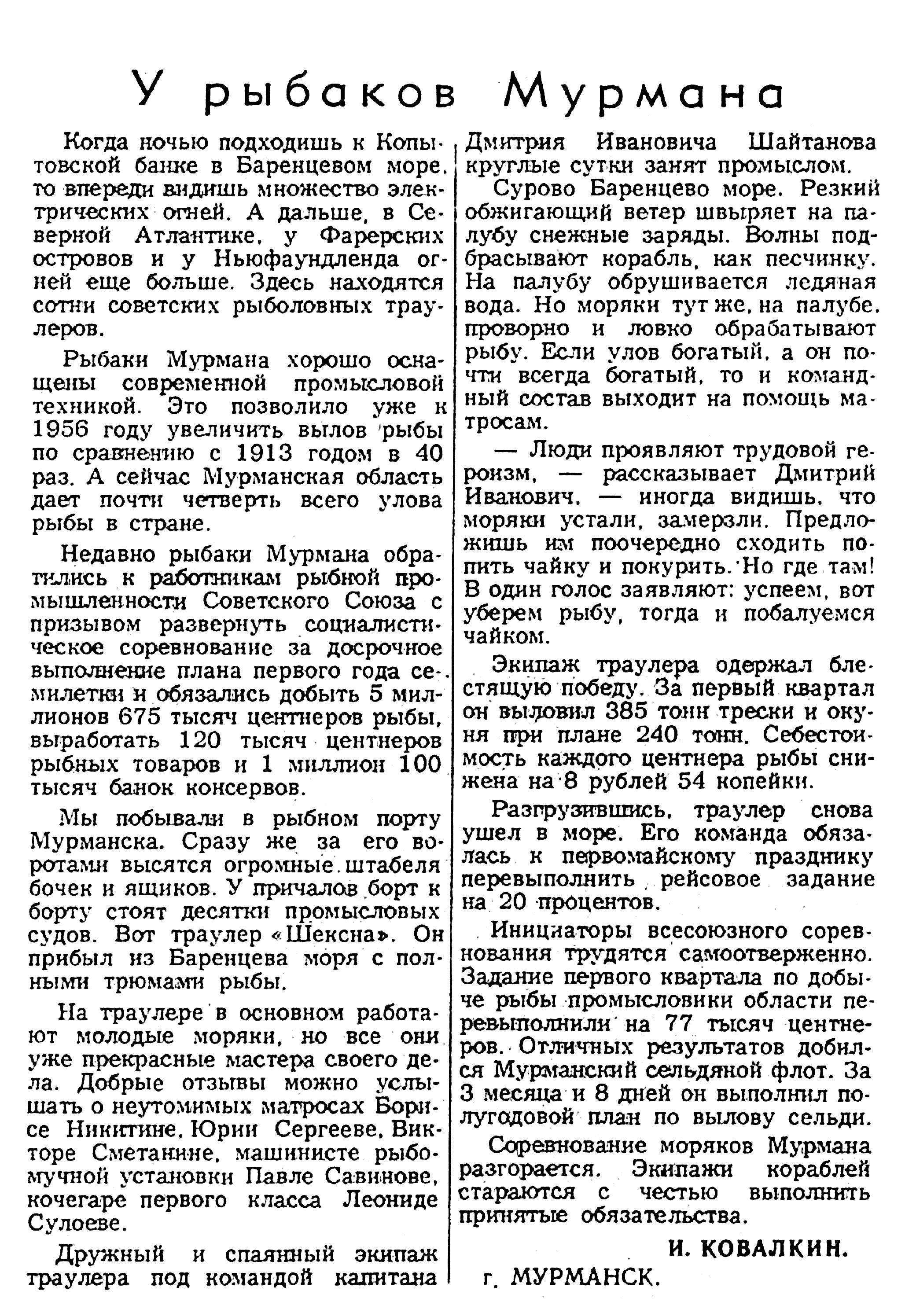 Инициаторы всесоюзного соревнования трудятся самоотверженно. Задание первого квартала по добыче рыбы промысловики области перевыполнили на 77 тысяч центнеров. Отличных результатов добился Мурманский сельдяной флот. За 3 месяца и 8 дней он выполнил полугодовой план по вылову сельди.