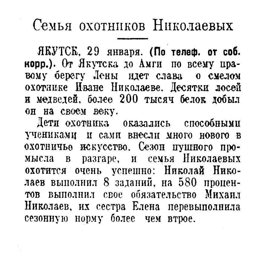 ЯКУТСК, 29 января. (По телеф. от соб. корр.). От Якутска до Амги по всему правому берегу Лены идет слава о смелом охотнике Иване Николаеве. Десятки лосей и медведей, более 200 тысяч белок добыл он на своем веку.