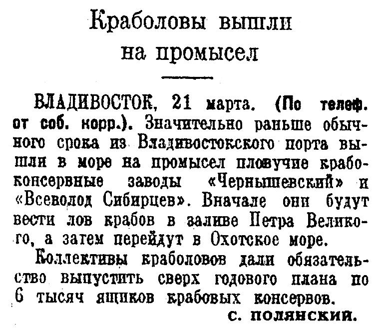 ВЛАДИВОСТОК, 21 марта. (По телеф. от соб. корр.). Значительно раньше обычного срока из Владивостокского порта вышли в море на промысел пловучие крабоконсервные заводы «Чернышевский» и «Всеволод Сибирцев». Вначале они будут вести лов крабов в заливе Петра Великого, а затем перейдут в Охотское море.