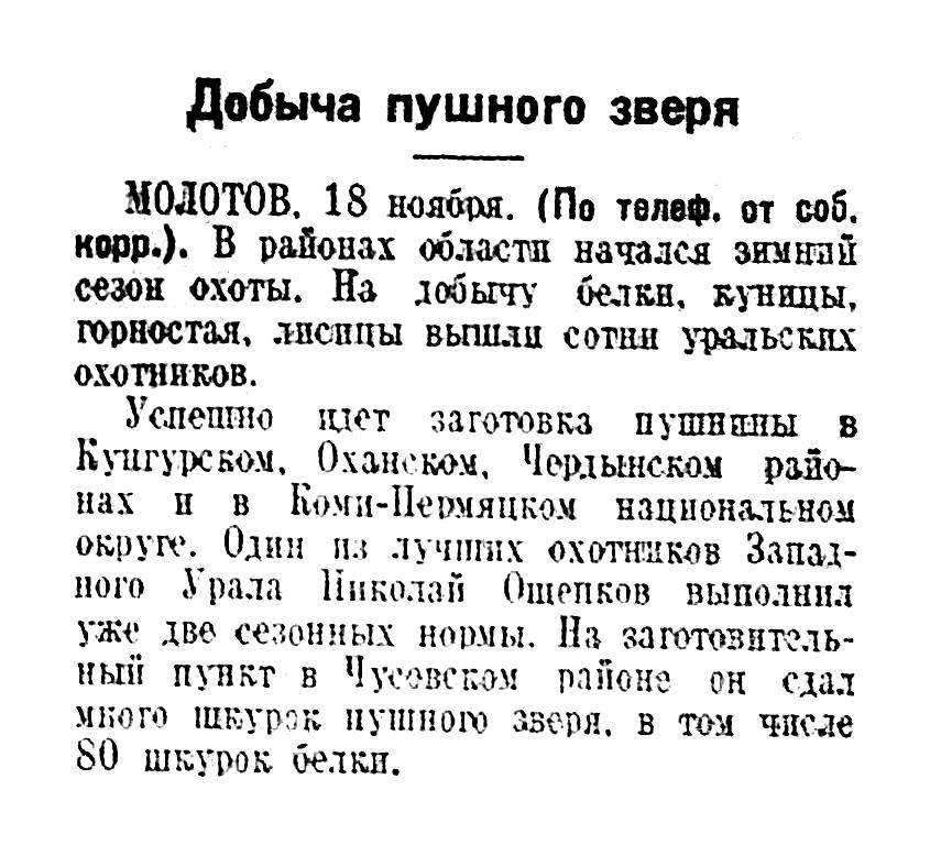 Успешно идет заготовка пушнины в Кунгурском, Оханском, Чердынском районах и в Коми-Пермяцком национальном округе. Один из лучших охотников Западного Урала Николай Ощепков выполнил уже две сезонных нормы. Из заготовительный пункт в Чусовском районе он сдал много шкурок пушного зверя, в том числе 80 шкурок белки.