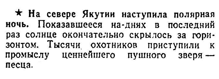 ★ На севере Якутии наступила полярная ночь. Показавшееся на-днях в последний раз солнце окончательно скрылось за горизонтом. Тысячи охотников приступили к промыслу ценнейшего пушного зверя — песца.