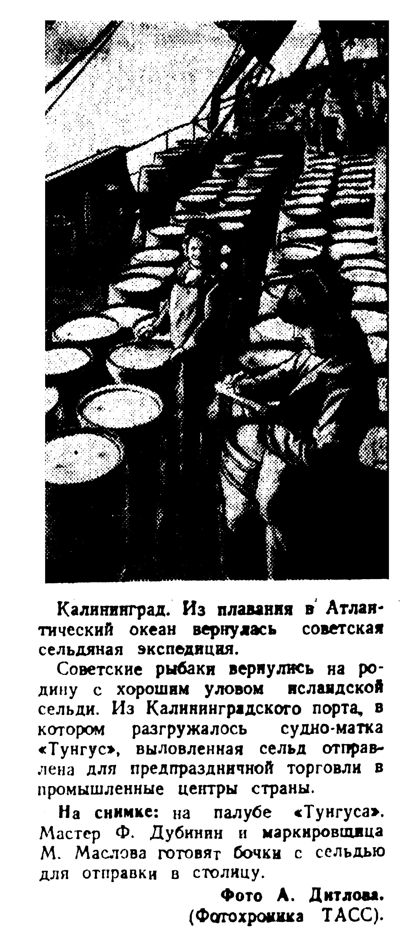 Советские рыбаки вернулись на родину с хорошим уловом исландской сельди. Из Калининградского порта, в котором разгружалось судно-матка «Тунгус», выловленная сельдь отправлена для предпраздничной торговли в промышленные центры страны.