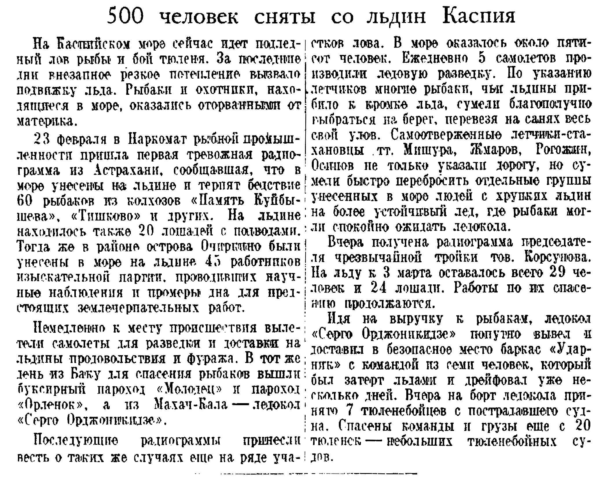 Правда, 1940, № 63 (8109), 4 марта.500 человек сняты со льдин Каспия