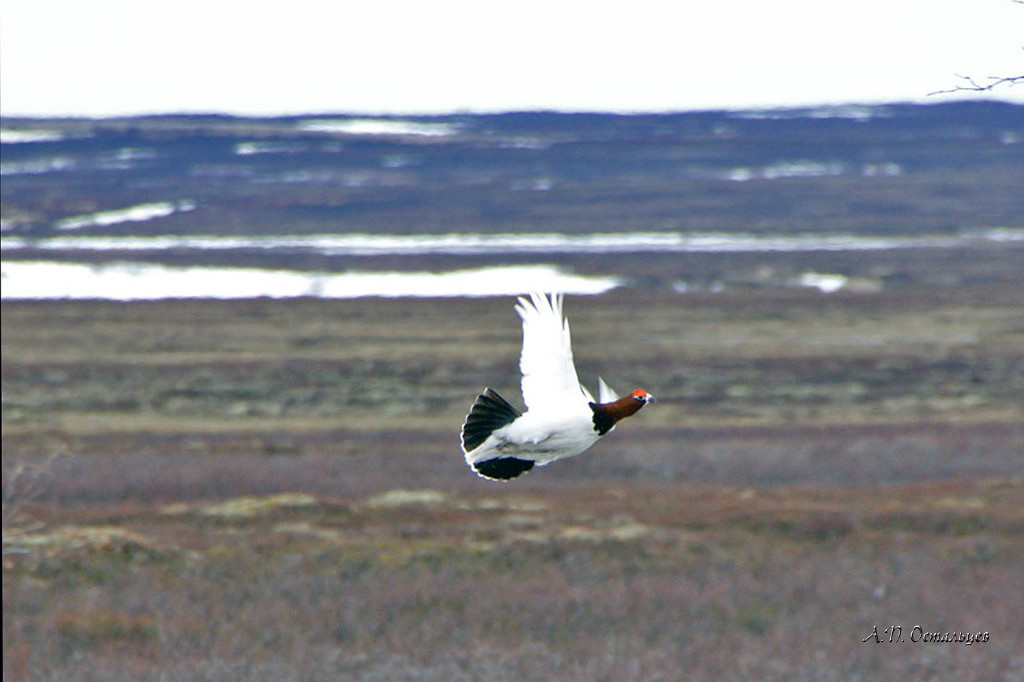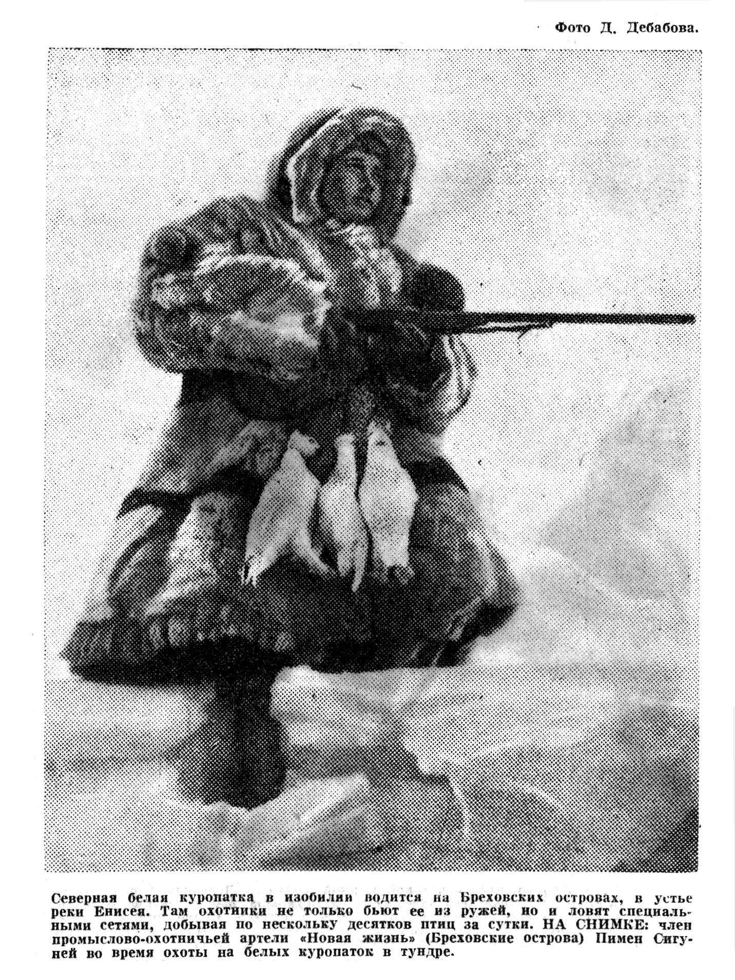 Белые куропатки, гнездящиеся в тундрах полуостровов Ямала, Гыдана и Тазовского зимуют как здесь, так и южнее — в лесотундре или северной тайге. Было установлено, что чем ниже средненоябрьские температуры в тундре, тем больше птиц летит на зимовку в лесотундру, причем критической является температура —20°С…—25°С. Снег не является здесь решающим фактором, поскольку зима сравнительно малоснежна, и в течение зимних месяцев происходит скорее перевевание снега, чем его накопление (Назаров. Шубникова, 1971). Даже в середине зимы значительные массивы кустарников на Ямале и Гыдане остаются открытыми (Сдобников, 1957), и зимующие куропатки наблюдаются в самых северных частях Гыдана, под 72°30' с. ш. (Назаров, Шубникова, 1971). Но большая часть птиц все же откочевывает отсюда южнее. Из тундр Ямала они прилетают на зимовку в лесотундру между Уралом и Обью, проникая по долине последней к югу до 64° с. ш. Птицы с Тазовского и Гыданского полуостровов зимуют в области устья р. Надым, в лесотундре между Надымом и Пуром, по долинам Пура и Таза, в низовьях р. Мессо-Яха (Назаров, Шубникова, 1971) Таймырские куропатки также зимуют в полосе лесотундры и в долинах ряда северотаежных рек, но основная их масса концентрируется в долине нижнего Енисея, от устья до Туруханска (Павлов, 1975). Весенний пролет длится на Таймыре до 2.5 мес., он приурочен к массовой миграции северных оленей в мае—начале июня. Многочисленные стаи белых куропаток сопровождают стада оленей, двигающиеся на северо-запад, расхаживая под ногами кормящихся животных (Кречмар, 1966) В Ленско-Хатангском междуречье отлет белых куропаток в лесотундру происходит уже в сентябре. В дельте Лены отлет основной массы птиц наблюдался в ноябре, когда снег сильно уплотнился и начались снежные метели; окончание ответа здесь определялось временем наступления полярной ночи во вторим половине этого месяца. Весенний прилет в дельту Лены происходил с 11 апреля и до конца этого месяца (Романов. 1934). В междуречье Лены и Колымы наблюдается такая же картина. Особенно интенсивный осенний пролет наблюдался в долине р. Чукочьей, где птицы двигались в стаях по 250 300 особей (Перфильев, 1975). На обширных пространствах Северо-Восюка СССР. где горные тундры чередуются с редколесьями долин, четко выраженных миграций с направлением “север — юг” нет. Белые куропатки всю зиму кочуют здесь без какого-либо определенного маршрута, стихийно скапливаясь в местах, богатых кормом.
