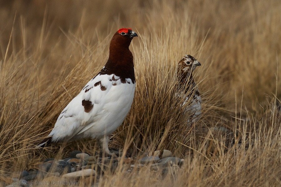 Общая характеристика и полевые признаки. Белая куропатка — наземная тетеревиная птица средних размеров, имеющая зимой целиком белую окраску, за исключением черных рулевых перьев. Летом эта окраска сменяется на пеструю с преобладанием коричневых, желтых, бурых и серых тонов. Самец весной легко узнается по сплошной кирпично-коричневой окраске головы, шеи и верхней части груди, резко контрастирующей с белым цветом остального оперения. Легко узнается также по белому цвету крыльев, хорошо заметному в полете. В природе может быть спутана только с тундряной куропаткой в местах их совместного обитания. Самцы этих видов легко отличимы только весной — у тундряной куропатки они токуют в белом наряде с небольшим количеством темных весенних перьев на голове. В остальное время как самцы, так и самки почти неразличимы, хотя вблизи в зимнее время самцы тундряной куропатки легко узнаются по черной полосе, идущей по бокам головы через глаз.