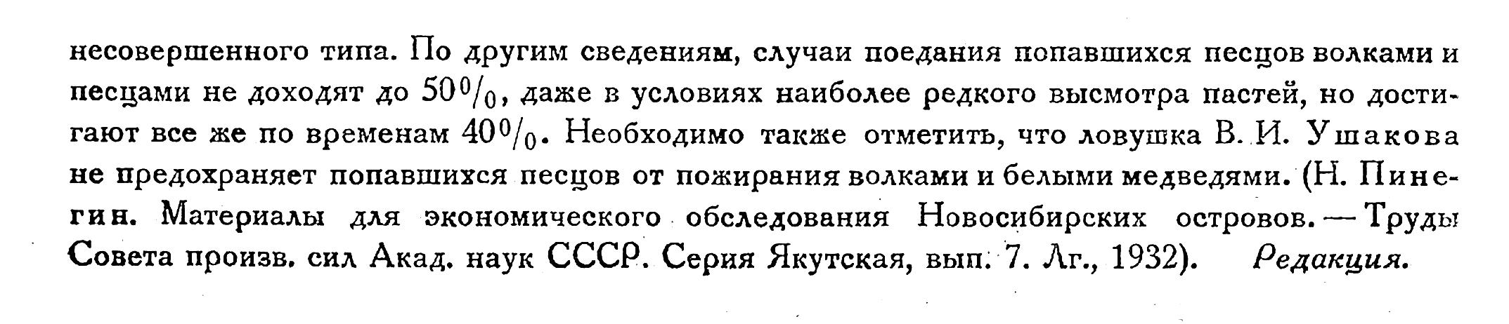 1) Повидимому, наблюдавшийся В. И. Ушаковым столь высокий средний процент поедания песцов песцами же должен быть отнесен к местным условиям последнего года, в районе бухты Тикси, где песцовые пасти, по данным А. А. Романова, крайне несовершенного типа. По другим сведениям, случаи поедания попавшихся песцов волками и песцами не доходят до 50%, даже в условиях наиболее редкого высмотра пастей, но достигают все же по временам 40%. Необходимо также отметить, что ловушка В. И. Ушакова не предохраняет попавшихся песцов от пожирания волками и белыми медведями. (Н. Пинегин. Материалы для экономического обследования Новосибирских островов. — Труды Совета произв. сил Акад. наук СССР. Серия Якутская, вып. 7. Лг., 1932). Редакция.