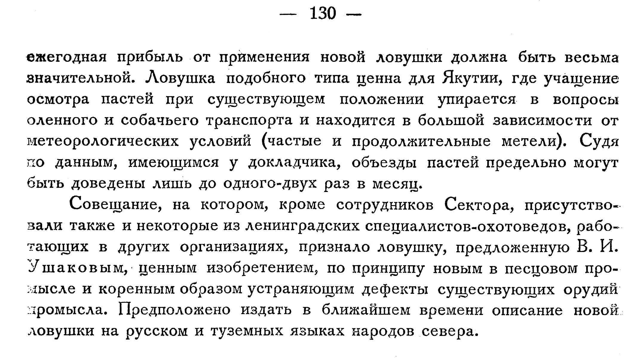 Совещание, на котором, кроме сотрудников Сектора, присутствовали также и некоторые из ленинградских специалистов-охотоведов, работающих в других организациях, признало ловушку, предложенную В. И. Ушаковым, ценным изобретением, по принципу новым в песцовом промысле и коренным образом устраняющим дефекты существующих орудий промысла. Предположено издать в ближайшем времени описание новой ловушки на русском и туземных языках народов севера.