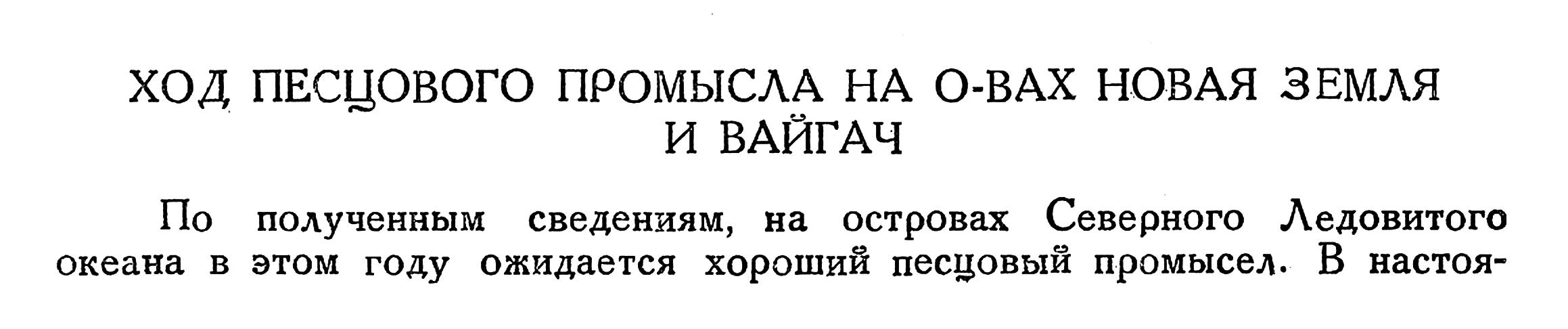 По полученным сведениям, на островах Северного Ледовитого океана в этом году ожидается хороший песцовый промысел. В настоящее время в Маточкином Шаре добыто 170 шт., в Русской Гавани 150 шт. и на Вайгаче 370 шт.