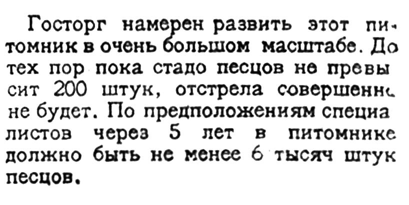 Госторг намерен развить этот питомник в очень большом масштабе. До тех пор пока стадо песцов не превысит 200 штук, отстрела совершенно не будет. По предположениям специалистов через 5 лет в питомнике должно быть не менее 6 тысяч штук песцов.