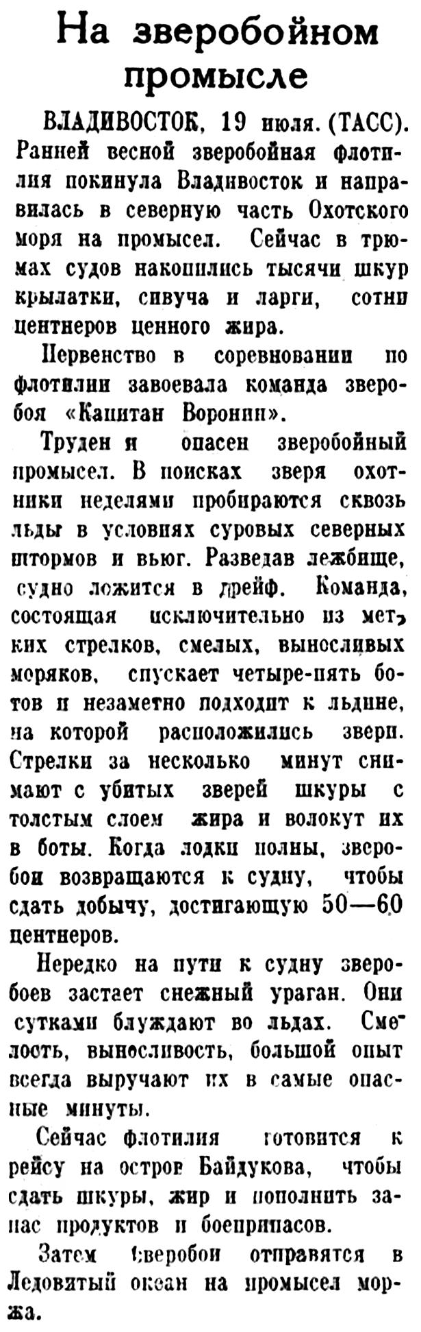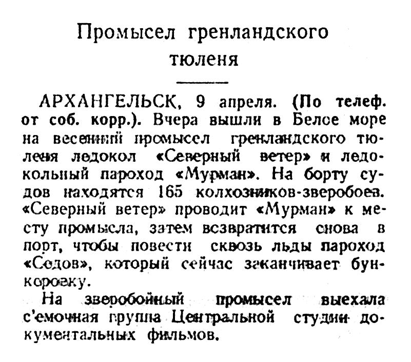 Во время войны в северных морях разбойничали немецкие подводные лодки, и лишь в прошлом году удалось частично возобновить промысел. Теперь зверобойная кампания развертывается в широких масштабах. В ней примут участие ледокольные пароходы «Дежнев», «Мурман» и орденоносный «Георгий Седов», знаменитый своим дрейфом через Центральный полярный бассейн в 1937—40 годах, а также линейный ледокол «Северный ветер».