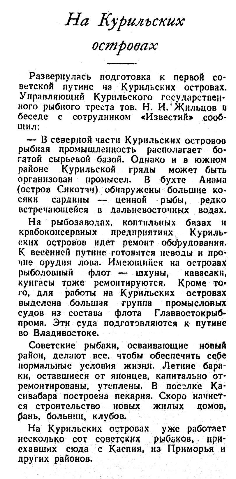 Развернулась подготовка к первой советской путине на Курильских островах. Управляющий Курильского государственного рыбного треста тов. Н. И. Жильцов в беседе с сотрудником «Известий» сообщил: