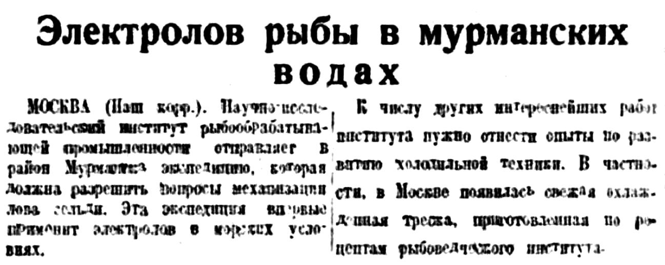 МОСКВА (Наш корр.). Научно-исследовательский институт рыбообрабатывающей промышленности отправляет в район Мурманска экспедицию, которая должна разрешить вопросы механизации лова сельди. Эта экспедиция впервые применит электролов в морских условиях.