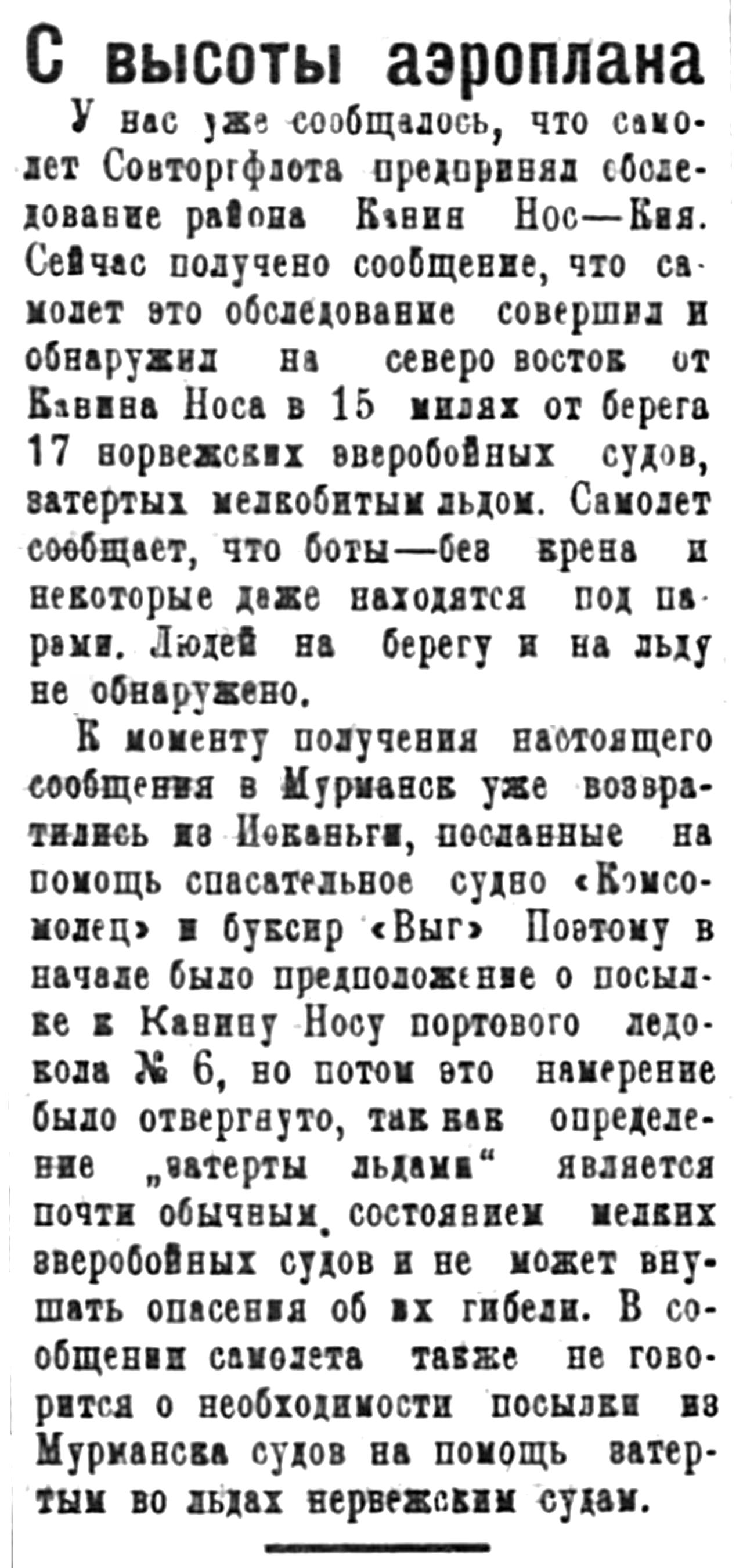 У нас уже сообщалось, что самолет Совторгфлота предпринял обследование района Канин Нос — Кия. Сейчас получено сообщение, что самолет это обследование совершил и обнаружил на северо-восток от Канина Носа в 15 милях от берега 17 норвежских зверобойных судов, затертых мелкобитым льдом. Самолет сообщает, что боты — без крена и некоторые деже находятся под парами. Людей на берегу и на льду не обнаружено.