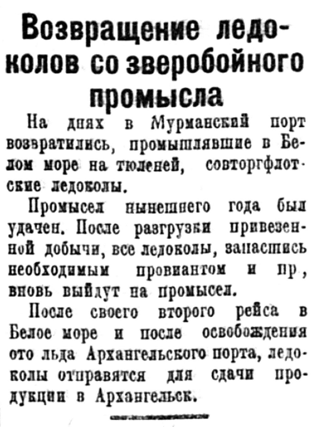 3-го мая в Мурманский порт на ледоколе № 6 прибыли с Канина Носа 19 норвежских зверобоев — команды двух потерпевших аварию в 20 милях от Канина Носа норвежских зверобойных ботов "Миан" и "Аврора".