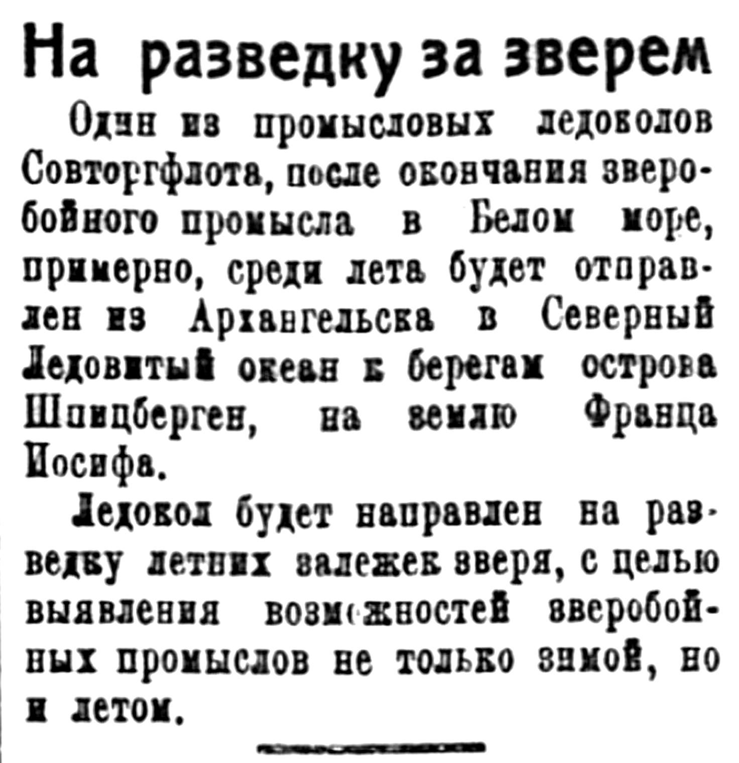 1-го июня на ледоколе «Седов» отправляется на летнюю разведку экспедиция Совторгфлота для обследования южной кромки льда в Северном Ледовитом океане на предмет организации там летнего зверобойного промысла.