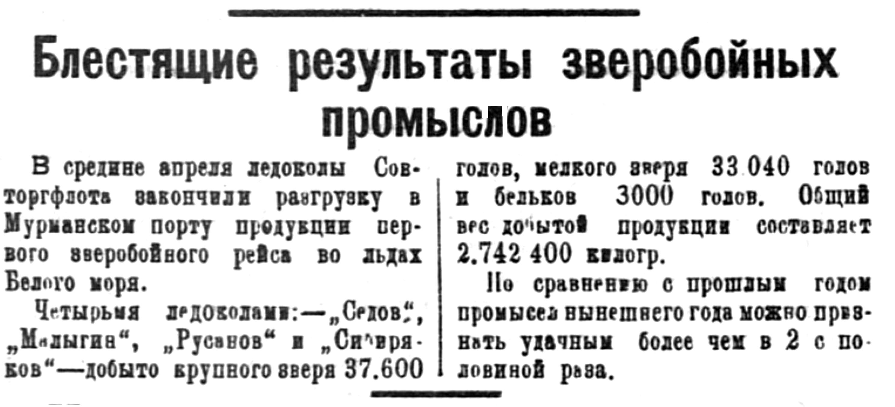 Четырьмя ледоколами: — "Седов", "Малыгин", "Русанов" и "Сибиряков" — добыто крупного зверя 37.600 голов, мелкого зверя 33.040 годов и бельков 3000 голов. Общий вес добытой продукции составляет 2.742400 килогр.