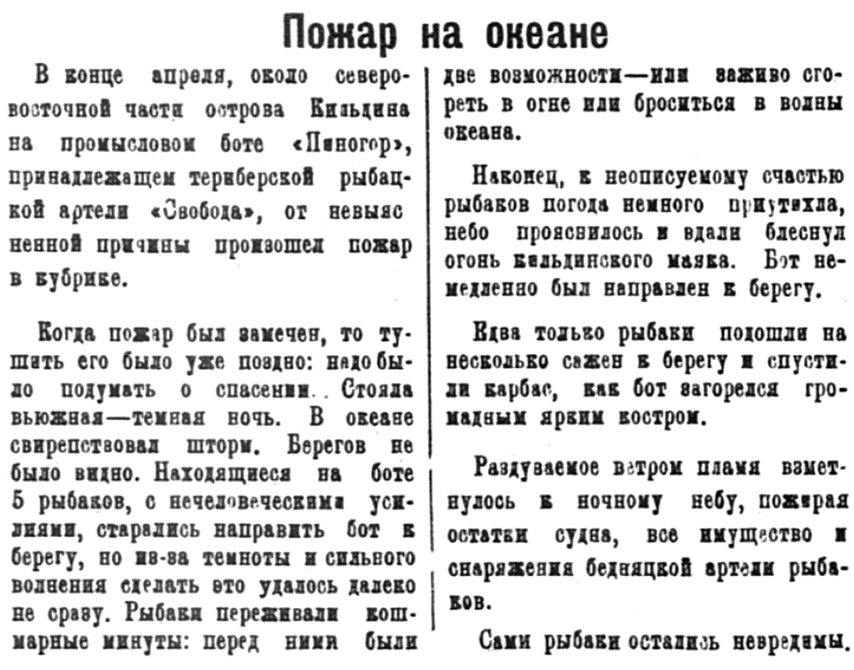 В конце апреля, около северо-восточной части острова Кильдина на промысловом боте «Пиногор», принадлежащем Териберской рыбацкой артели «Свобода», от невыясненной причины произошел пожар в кубрике.
