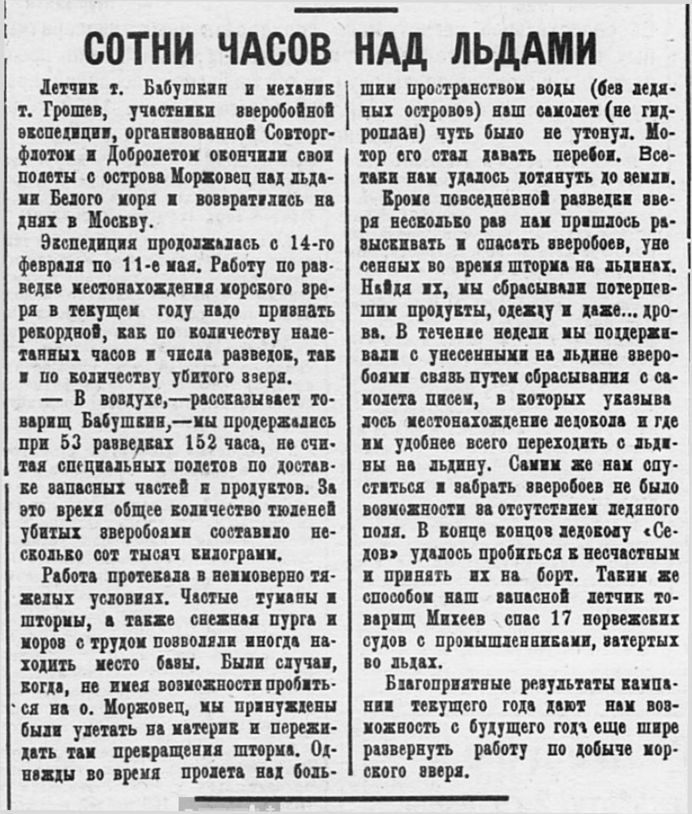 Летчик т. Бабушкин и механик т. Грошев, участники зверобойной экспедиции, организованной Совторгфлотом и Добролетом окончили свои полеты с острова Моржовец над льдами Белого моря и возвратились на днях в Москву.