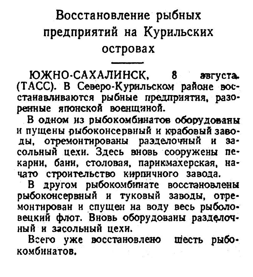 В одном из рыбокомбинатов оборудованы и пущены рыбоконсервный и крабовый заводы, отремонтированы разделочный и засольный цехи. Здесь вновь сооружены пекарни, бани, столовая, парикмахерская, начато строительство кирпичного завода.