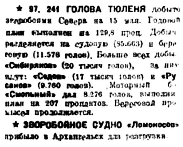 Несмотря на поздний выход в море (13 апреля ледокол стоял еще около Соломбалы), зверобойная кампания завершена русановцами успешно. За 20 дней промысла добыто около 10 тысяч тюленьих туш. 17 мая они были доставлены в Мурманский порт, там перегружены на "Альбатрос" и острожены (разделаны).