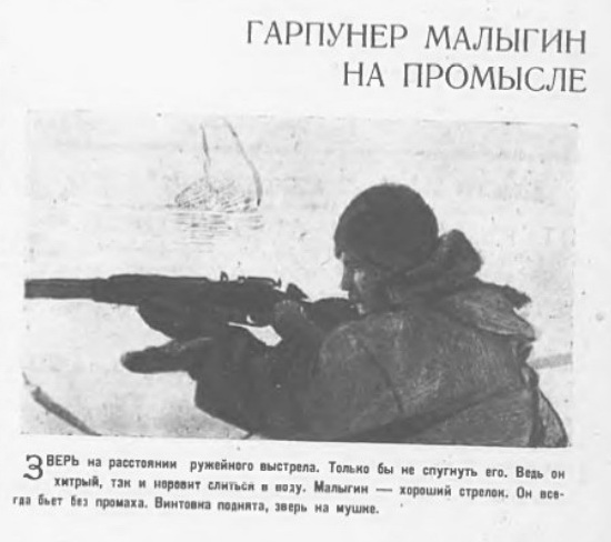 Учитывая повышенную пугливость зверя, надо разработать тактику промысла. Первый шаг в этом направлении — организуемые Архангельским теруправлением курсы стрелков-зверобоев. На курсы отобраны лучшие стахановцы-зверобои, которые после окончания их будут инструкторами по обучению кадров снайперов-зверобоев.