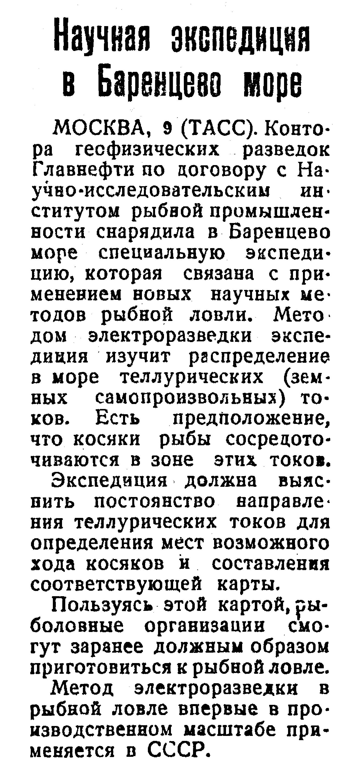 МОСКВА, 9 (ТАСС). Контора геофизических разведок Главнефти по договору с Научно-исследовательским институтом рыбной промышленности снарядила в Баренцево море специальную экспедицию, которая связана с применением новых научных методов рыбной ловли. Методом электроразведки экспедиция изучит распределение в море теллурических (земных самопроизвольных) токов. Есть предположение, что косяки рыбы сосредоточиваются в зоне этих токов.