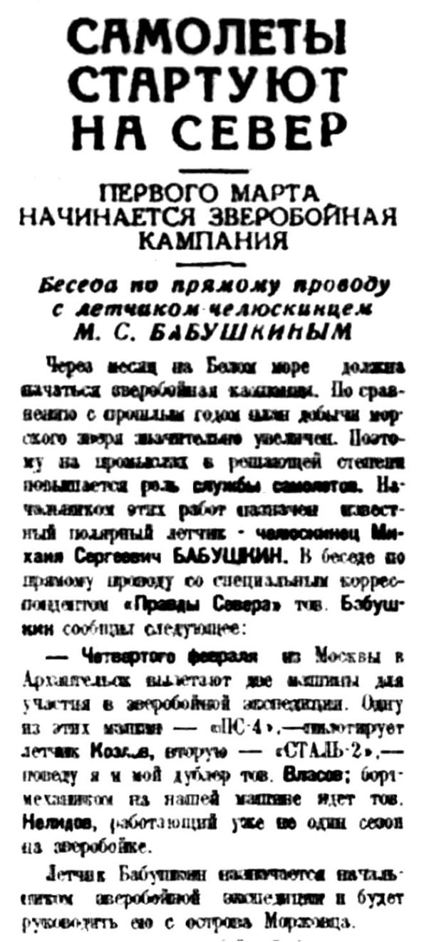 — Четвертого февраля из Москвы в Архангельск вылетают две машины для участия в зверобойной экспедиции. Одну из этих машин — "ПС-4" — пилотирует летчик Козлов, вторую — «СТАЛЬ-2», — поведу я и мой дублер тов. Власов; бортмехаником на нашей машине идет тов. Нелидов, работающий уже не один сезон на зверобойке.