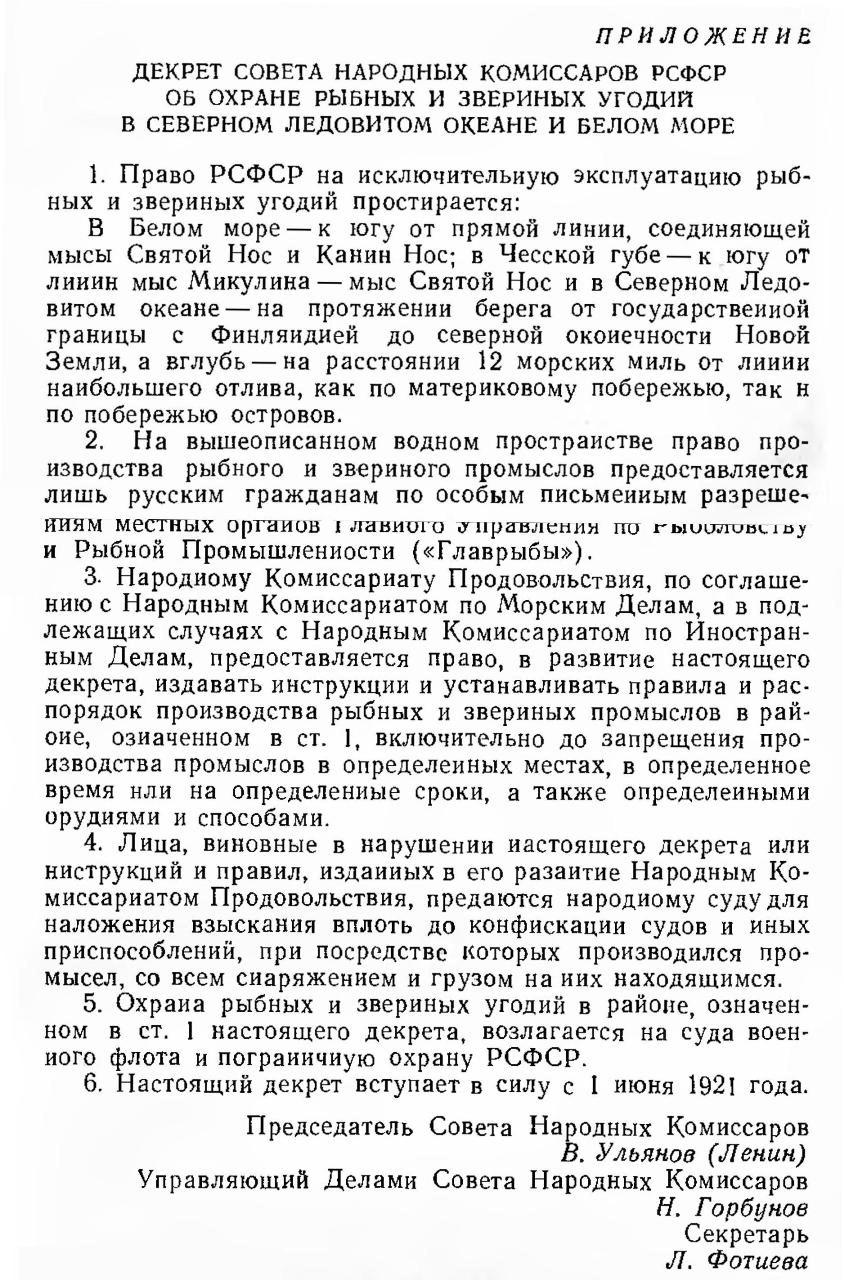 ДЕКРЕТ СОВЕТА НАРОДНЫХ КОМИССАРОВ РСФСР ОБ ОХРАНЕ РЫБНЫХ И ЗВЕРИНЫХ УГОДИЙ В СЕВЕРНОМ ЛЕДОВИТОМ ОКЕАНЕ И БЕЛОМ МОРЕ