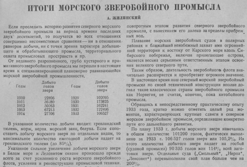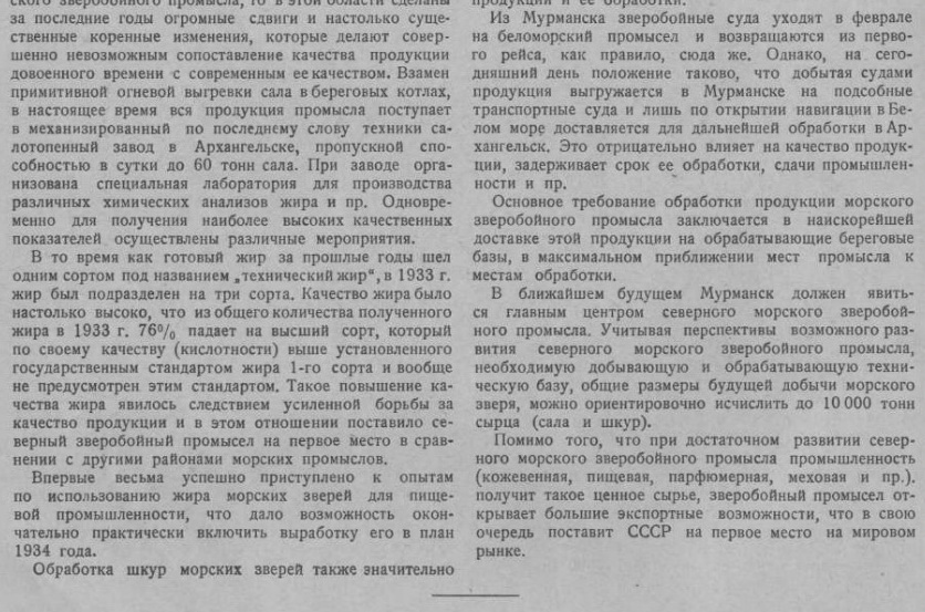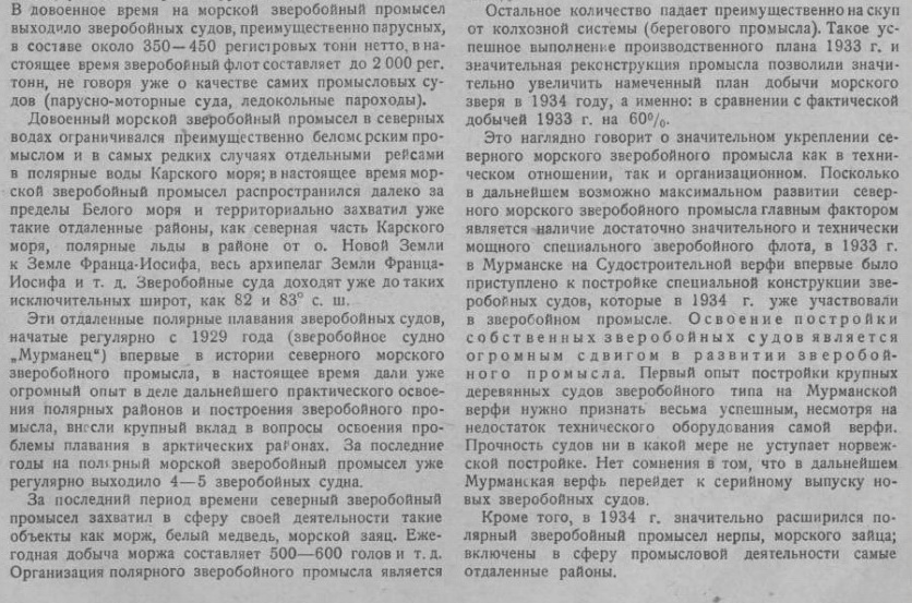 За 1934/35 г. по западному побережью, главным образом в южных становищах, из шкуры лысуна заготовлено 1876 м ремня. Случаев подхода моржа отмечено три: в конце сентября морж был у о-вов Пахтусова, в Русанове и в губе Митюшихе. Наблюдением установлено увеличение количества гнезд гаги в районе Митюшиха—Безымянная; так, например, на Большом Гагачьем о-ве, в губе Митюшихе, летом 1935 г. было найдено 500 гнезд, в то же время в 1934 г. там было найдено 240 гнезд, а в 1933 г. всего только 28 гнезд. Аналогичная картина встречается и на других гнездовьях гаги. Количество соби¬раемого пуха артелью возрастает из года в год.