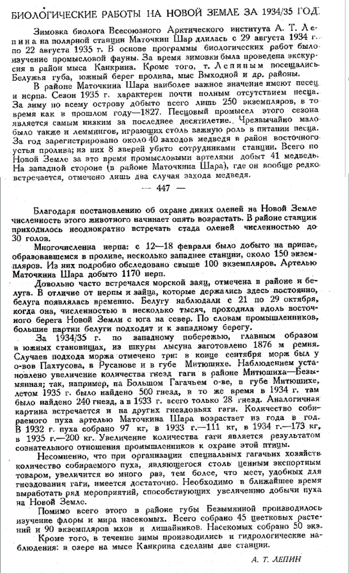 А. Т. ЛЕПИН. БИОЛОГИЧЕСКИЕ РАБОТЫ НА НОВОЙ ЗЕМЛЕ ЗА 1934/35 ГОД.// Бюллетень СССР. № 12. -Л., 1935 с.446-447
