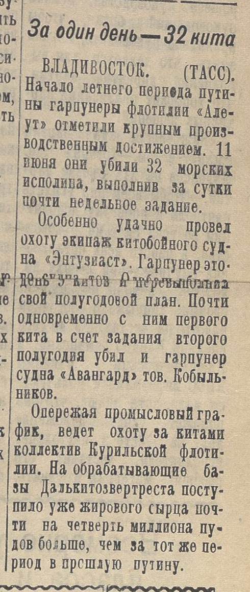 Китобойный промысел Владивостока. Заметка из газеты "Нарьяна-Вындер" № 119 (6120), от 19 июня 1953 г.